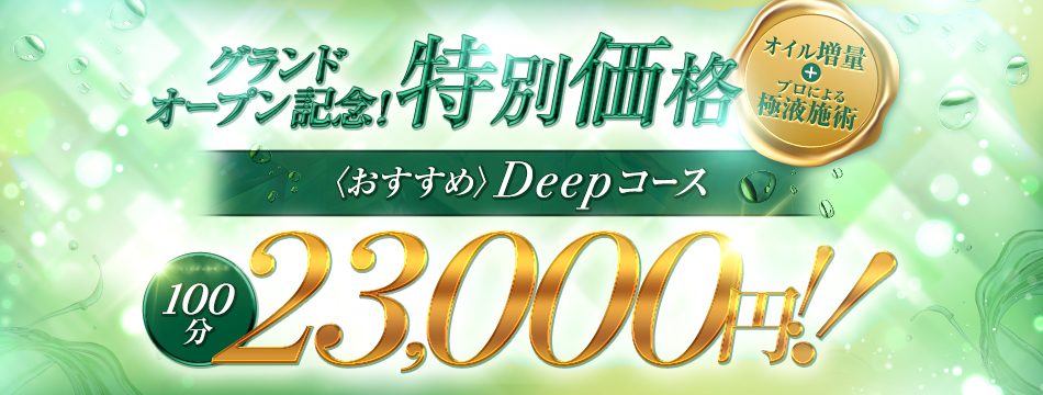 2026/04/08☆★☆新規グランドオープン☆★☆グランドオープンに伴い、ご新規様1回限りのクーポンをご案内させていただきます! 90分極液コース、21000⇒19000円でご案内します!迷ったらこのコース一択! 熟練のセラピストが心までコリをほぐします! Deepならではの深みのある施術をご堪能ください。